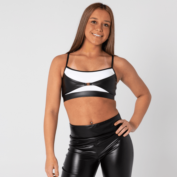 Get ready to make a statement in our Distinct Crop! Made with lux fabrics and faux leather over lycra, it's a dance class and performance must-have. The edge crop design, faux leather adjustable straps, and clip at the front add extra detail, while the wide band provides support and style. Plus, removable padding for adult sizing. Perfectly paired with our Intensive Tights, Execute Flares, and Splitz Skirt. Dance and perform with confidence and style.
