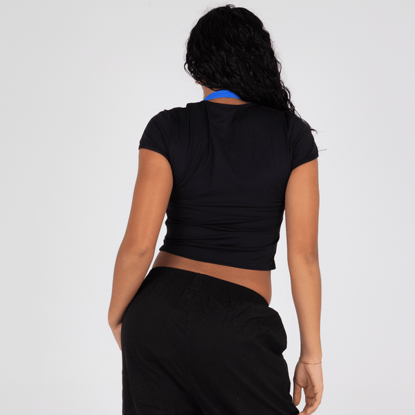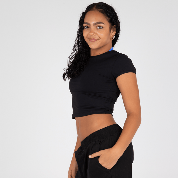 The Baby Tee: a playful twist on a classic. With capped sleeves, soft and luxurious fabrics, and a round neck, this fitted t-shirt adds a touch of comfort and style to any outfit. Made with lycra for a perfect fit, and available in black or white. Get ready to rock that longer crop! Definitely a must have in the dance wardrobe or a great additive to a studio uniform.