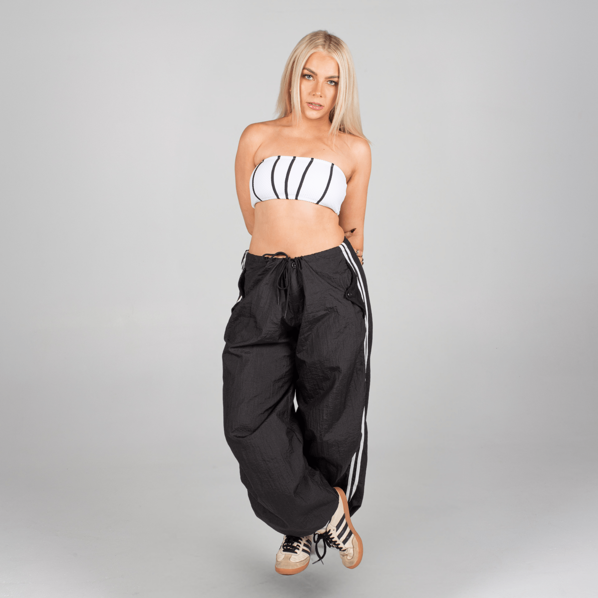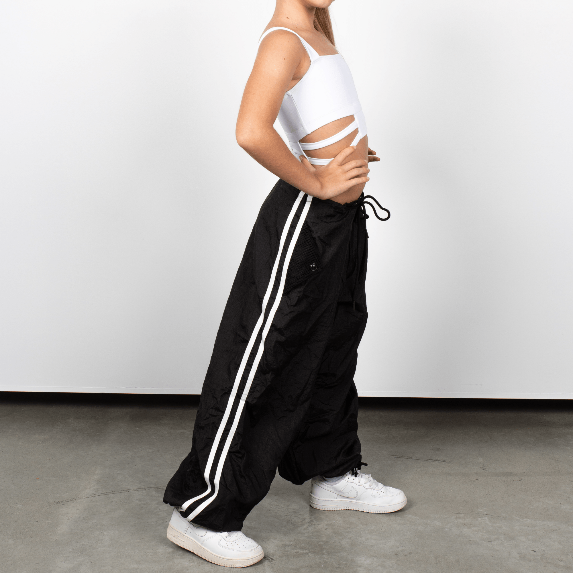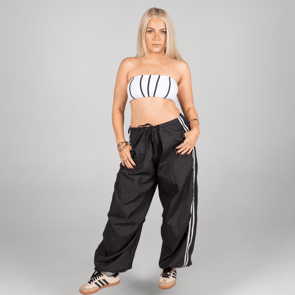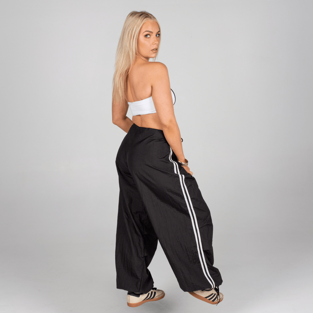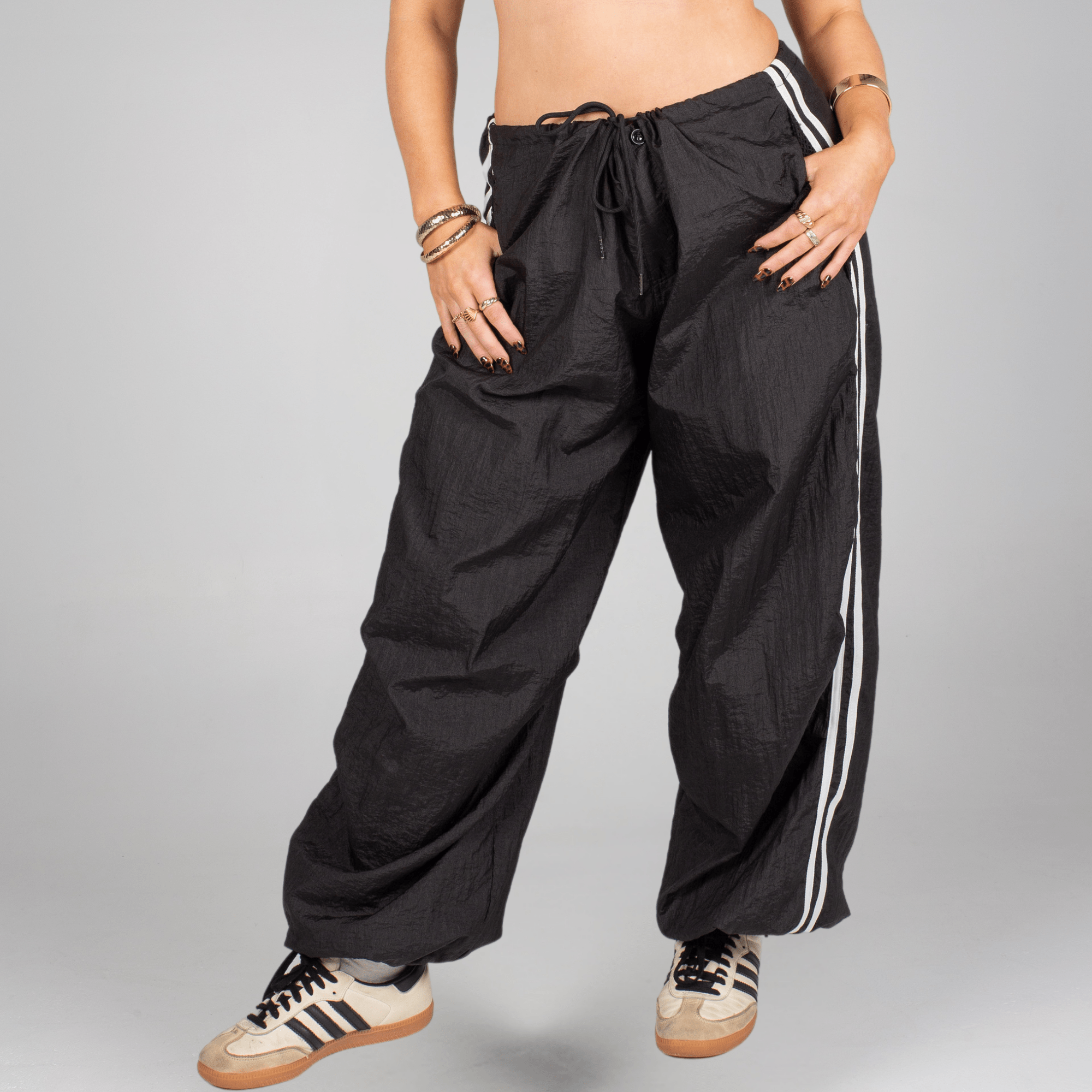 Step into comfort and edge with these ultra-lightweight parachute pants—designed to move with you, wherever you go. Featuring bold two-stripe detailing down each leg for a sporty, throwback vibe, they’re made to be worn your way: low-rise, high-waisted, or slouched, thanks to the adjustable external drawstring waistband.